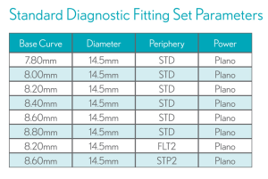 Fitting SetKeraSoft IC is fitted using an 8 lens Fitting Set. There are 6 STD (Standard) periphery lenses ranging from 7.80 to 8.80 mm base curves 1 × 8.20: FLT2 periphery lens (nipple cones)
